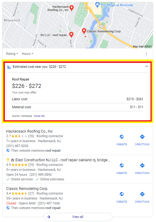 Why we care. If you or your clients offer local repair services, such a roofing repairs, you may want to see that your price estimates fit within the range of what is displayed in these Google search results. To me, in the Hackensack, NJ area, these estimates seem incredibly low and I do wonder if a roofing company can actually deliver the services necessary for the prices displayed in these Google search results. If not, the customer on the other end of the call may not be happy, which may lead to a negative review even if they do not hire your company.