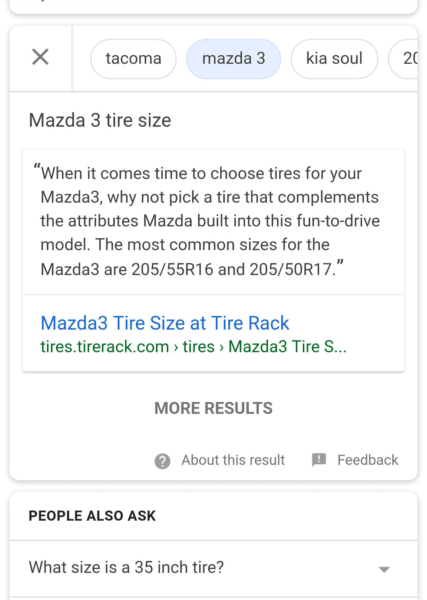 You can also see the refinements at the top of the screen shot above. Here is another screen shot of these refinements directly in what is called a featured snippet.