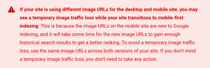 Site owners should stick to persistent URLs for their images and use the same alt text across desktop and mobile. Google also warns that you may experience a temporary image traffic loss during the transition to mobile-first indexing if you’re using different image URLs for desktop and mobile.