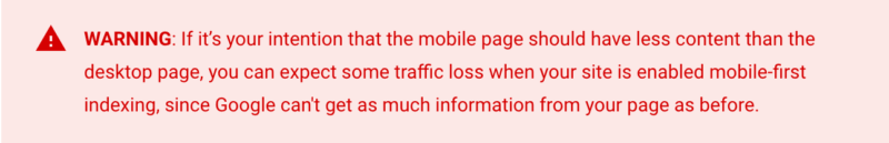 The same content across mobile and desktop. Google has advised developers to maintain the same primary content across the desktop and mobile versions of their sites, but the documentation now includes the following warning.