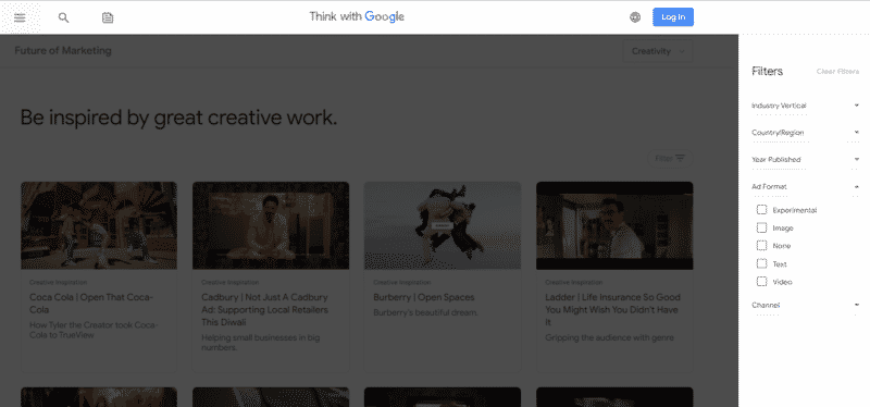 Creative inspiration. If you are an advertiser looking for inspiration with your assets, Google has a new home for you. Creative inspiration is a filterable tool that allows you to surface some of the best ad creative from around the globe.