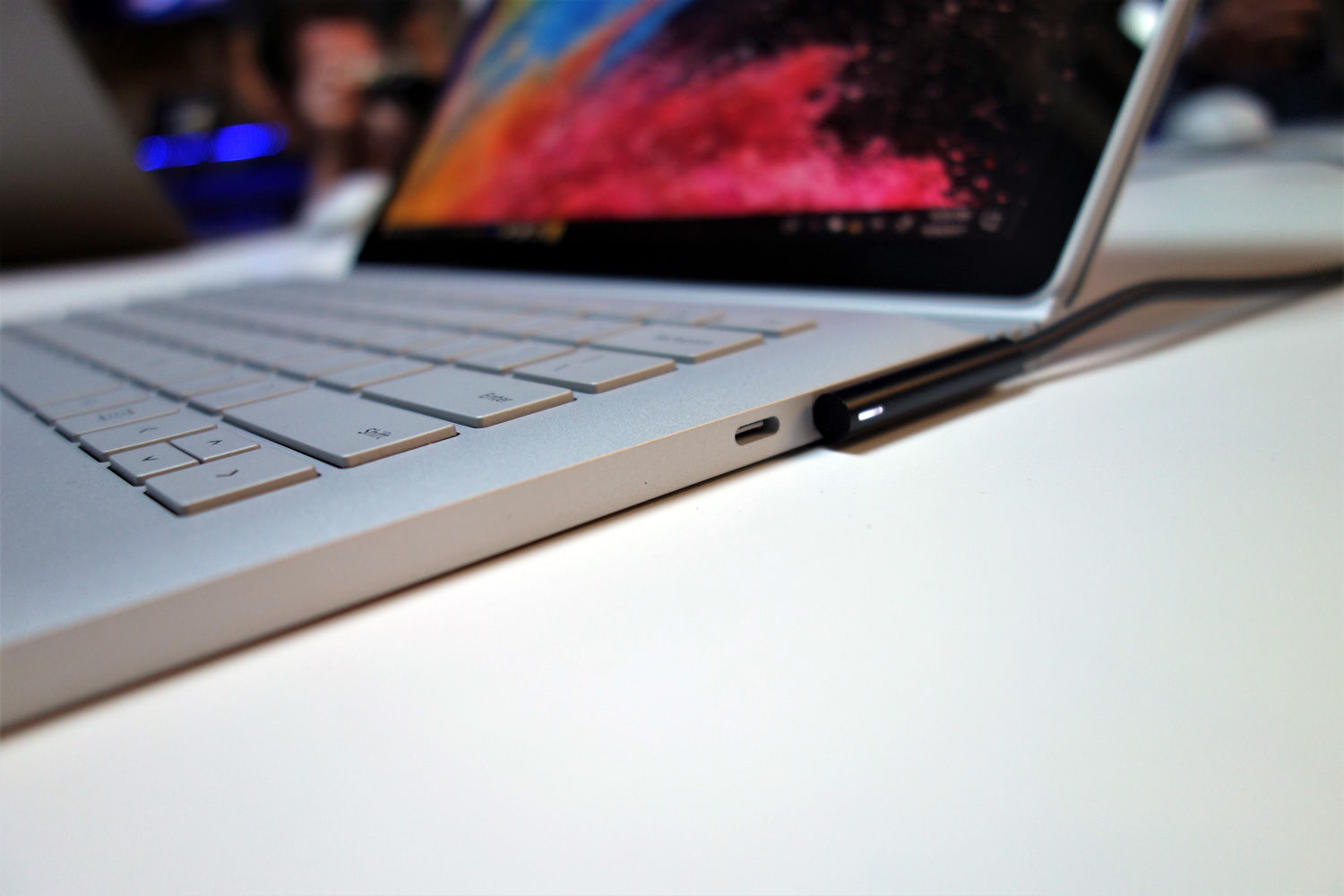 Like previous members of the Surface family, the Book 2 has a pair of Surface connections, which it uses for power and I/O: one that connects the base to the tablet; and a second on the right of the tablet, for power or connecting to the Surface Dock.