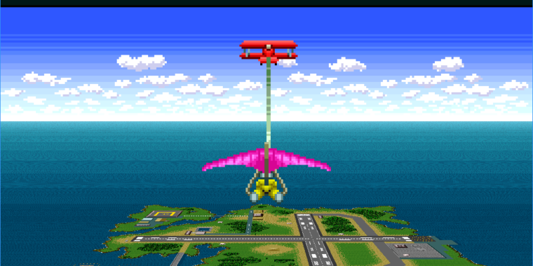 In the original Pilotwings, the far-off island is just a blob of pixels.