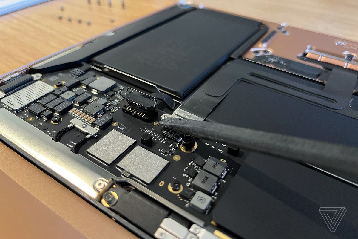The 2011 MacBook Pro’s battery is much easier to disconnect; you don’t even need to take the battery out. Ditto the M1 MacBook Air’s battery: all it takes is a flip-up and pull of the metal locking handle of the battery connector. (See image above.)