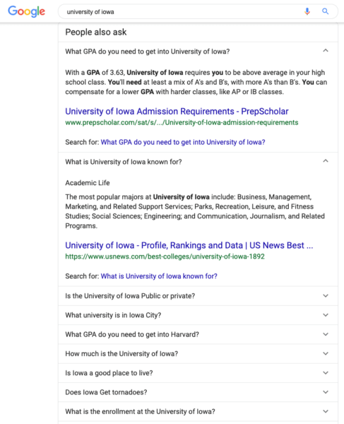 The questions in the PAA are typically being answered by websites other than university. In Google’s eyes, these websites have better-answered questions than the university’s own website has. This is an issue for two reasons: