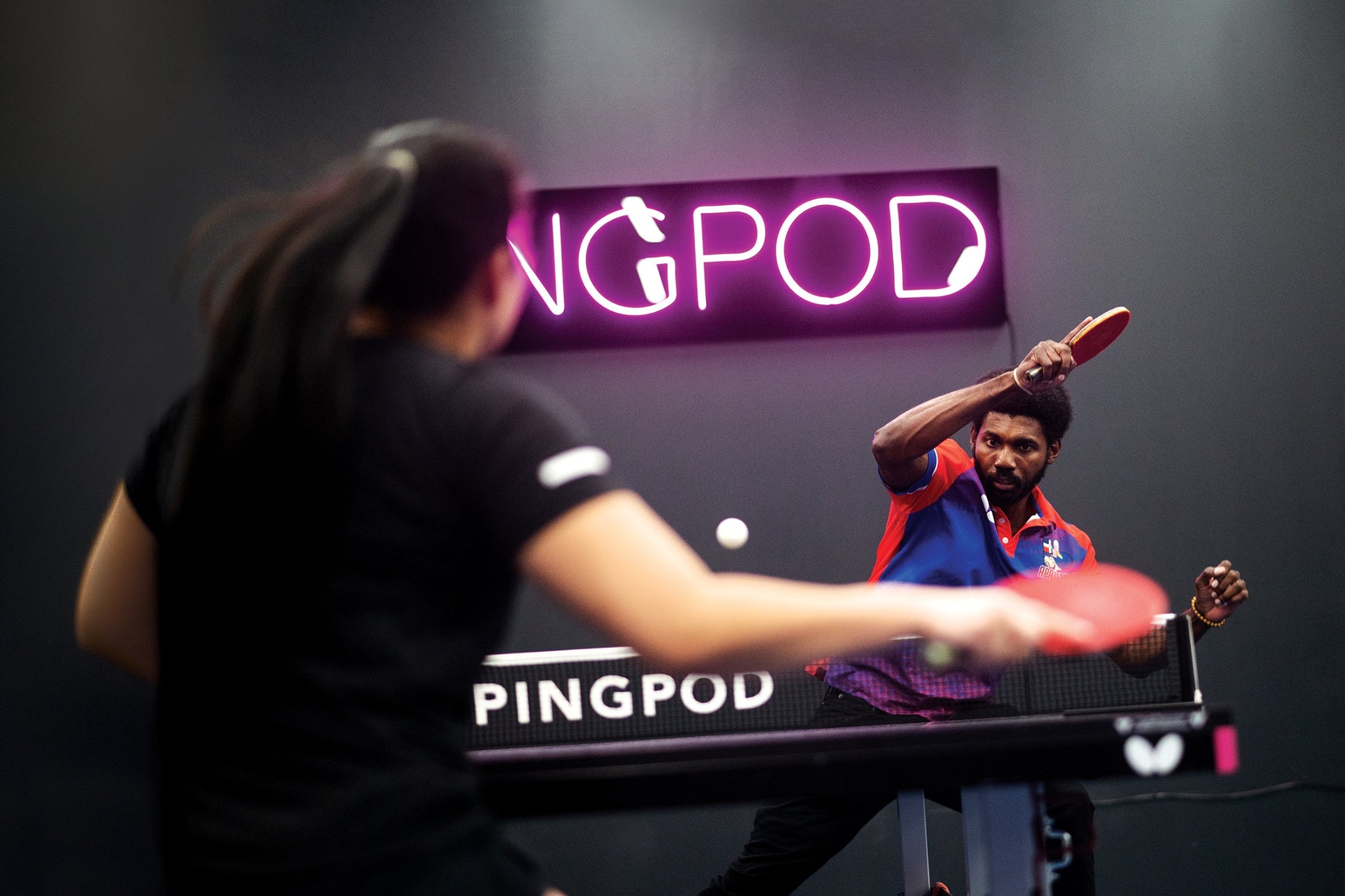 It’s clean and brightly lit, with floor-to-ceiling windows. A ping-pong table sits in the center of each room, and a neon pink PingPod sign glows against a black accent wall. The morning I visit, two tall, muscled guys are playing in a street-level room, wearing athletic gear and sweatbands. I watch one serve — with that deliberate little slowdown in the air that marks a serious player — and the other return it beautifully. It’s like a real-world “fitspiration” reel.