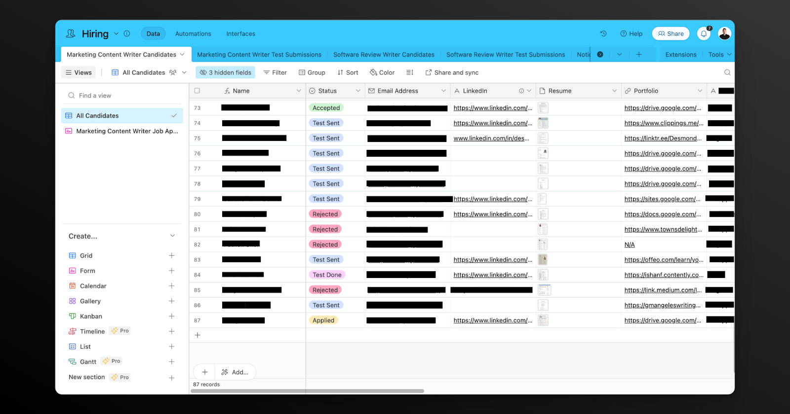 Now it was time to put everything together with an automated hiring system. After trialing a few paid products, I built my own on Airtable as a more cost-friendly option.