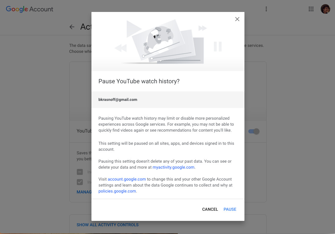 - You’ll see two checkboxes, one that says “Include the YouTube videos you watch” and the other that says “Includes your searches on YouTube.” If you uncheck either, you will pause the collection of that particular history.