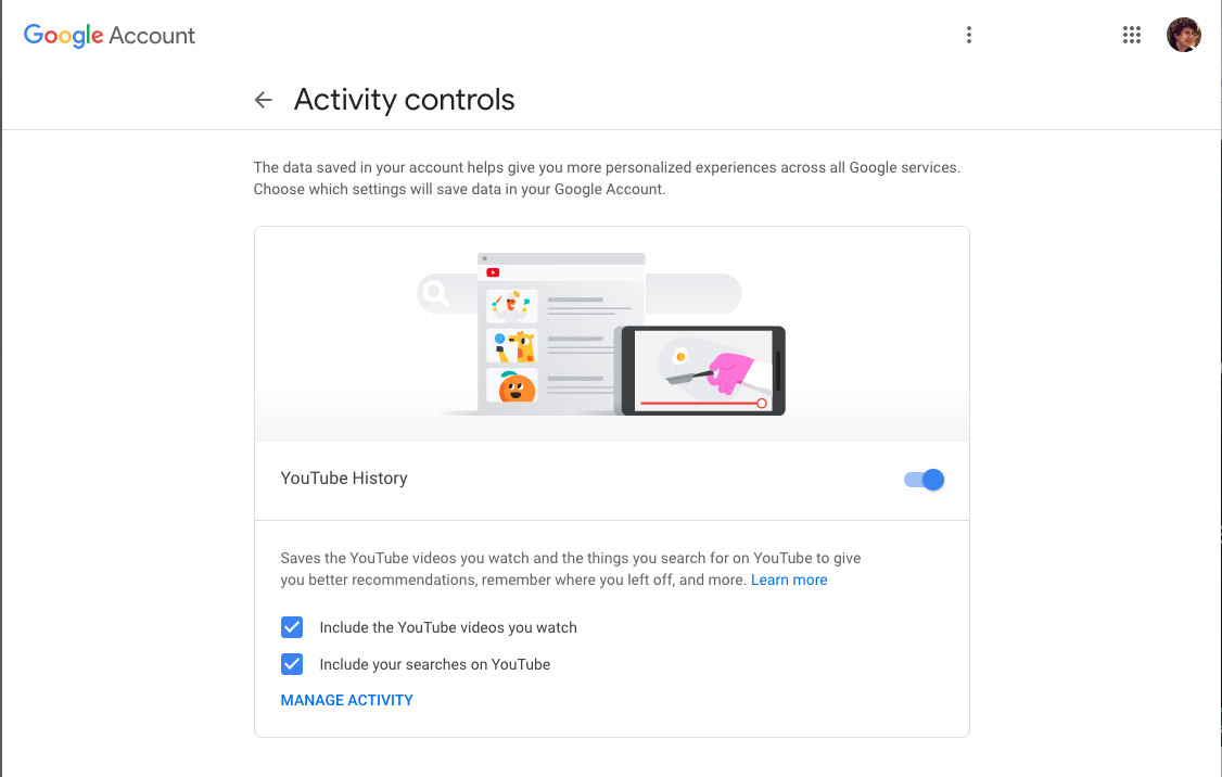 - Go to the Activity controls for your YouTube history. You can either follow this link to get there directly, or you can get started from your main Google account page. Find and click on the “Data & personalizations” tab, then “YouTube history” > “Manage activity.”