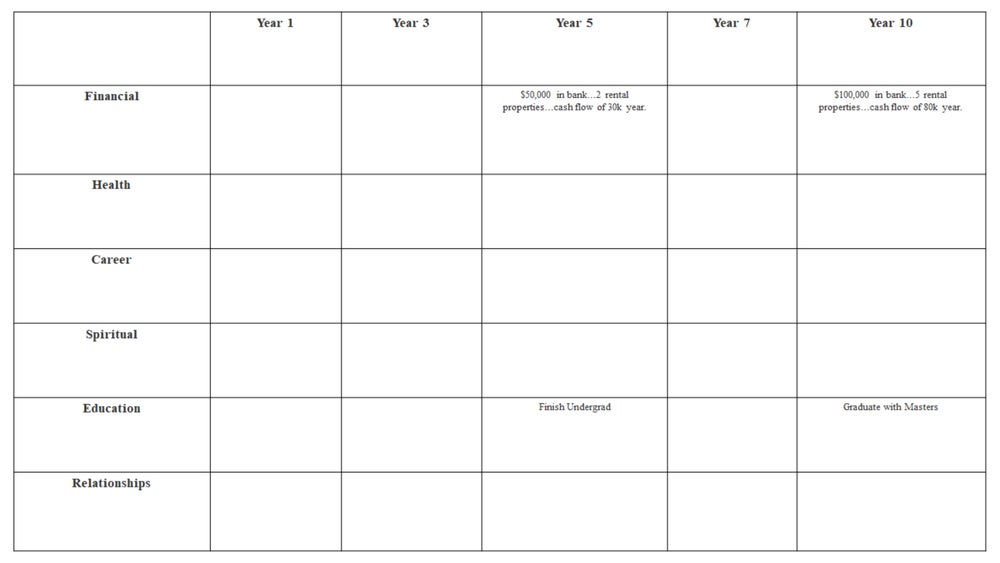 Finally, don’t be dogmatic or a slave to the plan, and certainly not to the point your miserable or make unwise decisions. For example, to stick with the rental-property decision, if your plan is to have 10 rentals in 10 years, don’t think you have to buy a rental every yearm and certainly not in the first year if you aren’t ready for it. Maybe you have to take one step backwards to take three steps forward. Thus, maybe your first year or two is about getting out of debt, better educated and working under mentors. Then, when the third year comes along, you might be able to purchase two properties a year, and by year five, you are right on track.