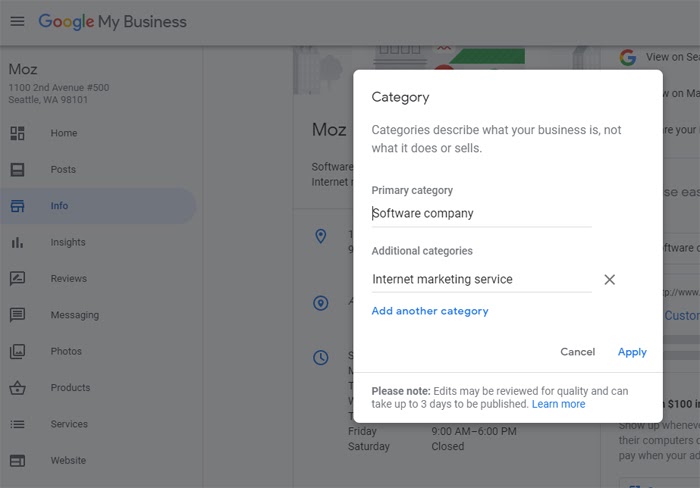 In the above screenshot, you can see that our categorizing Moz as a software company is causing Google to suggest that we might also want to select “accounting software company”. In this case, the suggestion is irrelevant for Moz’s business model, but it’s a good idea to see if Google is making any valuable suggestions for your company.
