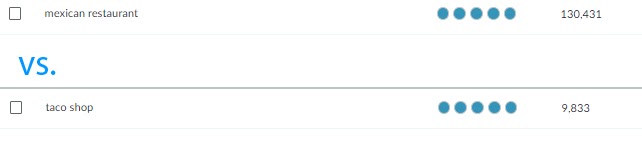 Next, take your list of keywords and enter them into your choice of free or paid keyword research tools to discover which terms have the highest potential search volume. For example, Moz’s Keyword Suggestions tool within Moz Keyword Explorer can help you determine the difference in search volume between two terms like “Mexican restaurant” vs. “taco shop”: