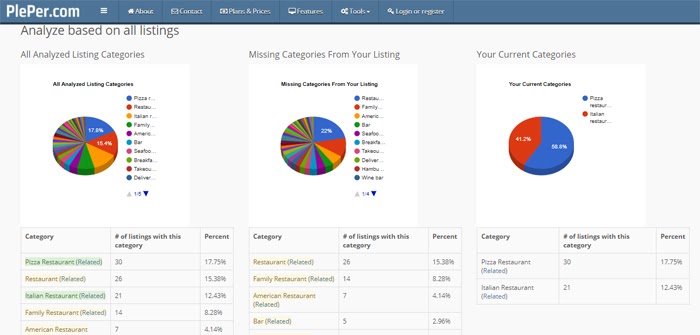 Based on your lat-long coordinates, PlePer shows you your current categories, the categories being used in your area, a list of category suggestions, and other useful information. Quite cool! The free version of this tool lets you do three such searches per day. Jot down any notable findings that were absent from using GMBspy.