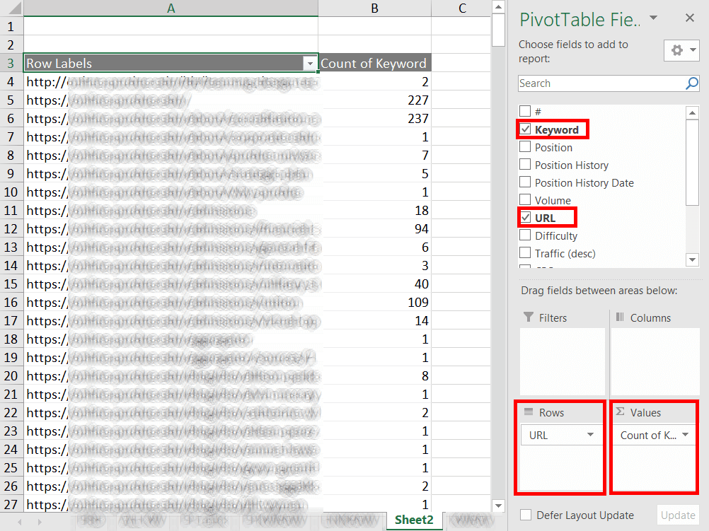 Once your PivotTable has been created, you’ll need to choose the fields in which you want the data displayed. Add “URL” to the Rows field and “Keyword” to the values field. Make sure your keyword value is displaying “Count of Keywords.”