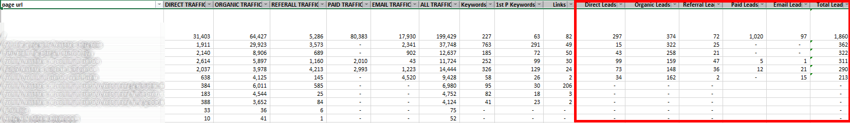 It’s time to incorporate the most important KPI to this master document. Revenue and or conversion data. For this example, I leveraged lead counts (form fills) as the primary goal. While I was able to export goal values in Google Analytics, you will need to identify the best source for your site’s revenue/conversion data. After layering in conversion and or revenue numbers, your master spreadsheet will look something like this.