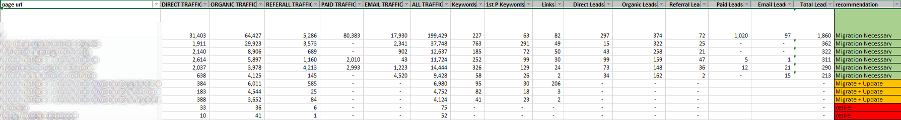 This content migration analysis will contain a lot of data. Leadership doesn’t want to look at your page by page analysis. They want (and need) to see your recommendation in addition to any performance impact they should be aware of. Don’t overthink this. Create a tab at the very beginning of the document often serves this purpose.