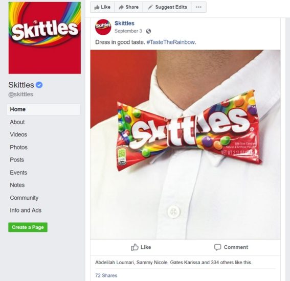 Skittles uses the slogan “Taste the Rainbow” throughout their advertising. Note in the screenshot above how they even use the slogan in a hashtag on Facebook. The slogan works because it sums up the product with its rainbow-colored candies and also describes the action the user takes — taste.