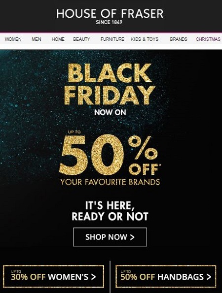 Once your subject line grabs attention, you need to encourage them to take action, so put your Black Friday deals front and center. Take a look at this example from House of Fraser. Immediately, readers know that they can get up to 50 percent off of their favorite brands, including women’s fashion and handbags.