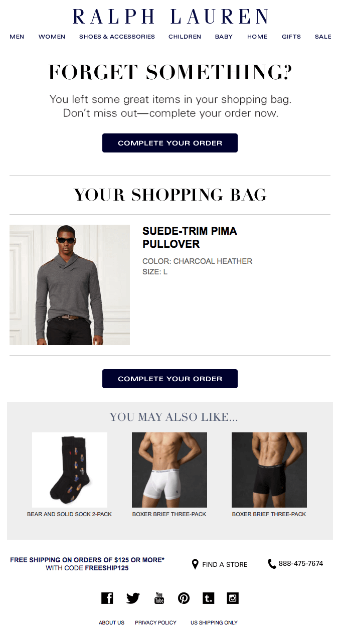 To combat abandoned shopping carts, create an abandoned cart email series. Abandoned cart emails, like the one below from Ralph Lauren, remind shoppers they have items waiting for them.