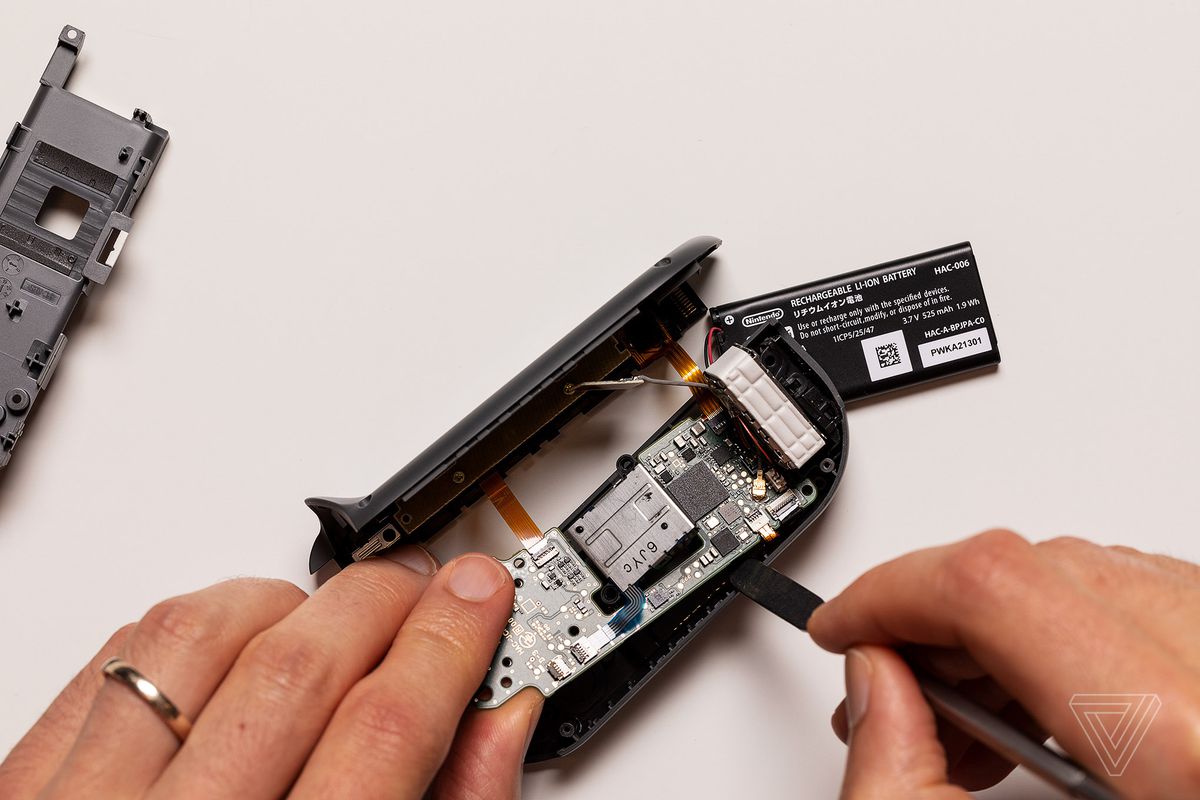 - Here’s the first part that you’ll encounter that’s unique to the right Joy-Con: an antenna. You’ll want to carefully lift this up and out of the plastic enclosure that it rests in, taking note of how it should go back in. You don’t need to completely detach it from the board; the rest of the Joy-Con swap process wasn’t made any harder with it left attached.