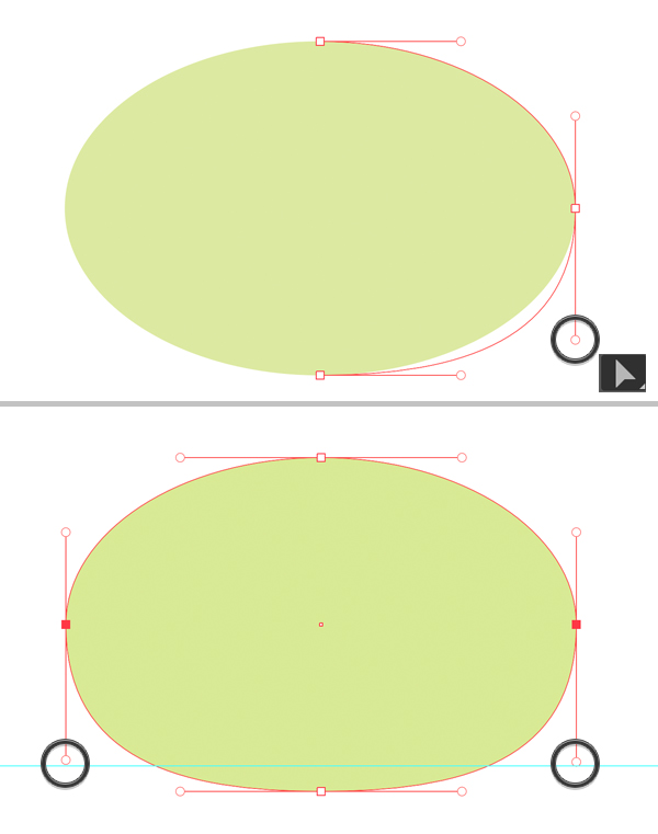 Take the Direct Selection Tool (A) and select the anchor point on the right. Click the bottom handle and let’s drag it down a bit, making the shape more squared and flat in the bottom. Repeat the same for the opposite side of the ellipse.