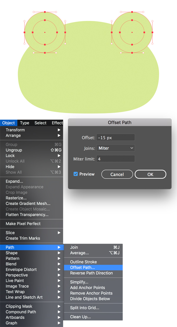Select both circles and go to Object > Path > Offset Path. Set the Offset value to -15 px to create new circles inside the eyes.