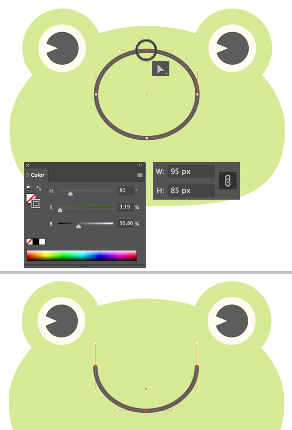 Now we’ll create a mouth. Make a 95 x 85 px ellipse and set the Stroke color to dark-grey in the Color panel. Set the Fill color to None.