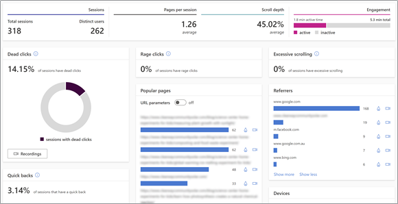 Clarity is a wonderful free tool from Microsoft that connects from Bing Webmaster Tools and provides a rich tapestry of experience metrics as well as individual session recordings. There is no better way, in my opinion, to understand user experience than reviewing session recordings. You can see when people are reading, see when they are having to close 15 popups, see when the hamburger menu keeps closing unexpectedly, and see if there are other things getting in the way of something you want them to do.