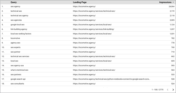 In Google Data Studio, you can quickly pull user searches and landing pages along with other informative metrics like clicks and impressions.