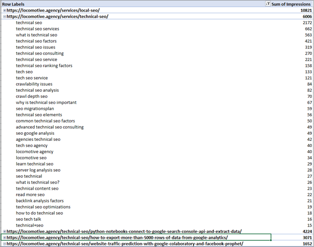 Downloading these to a CSV and using a simple pivot table in Excel or Google Sheets allows you to get a high-level view of what the best relevance engine on the planet, Google, thinks your page is about.
