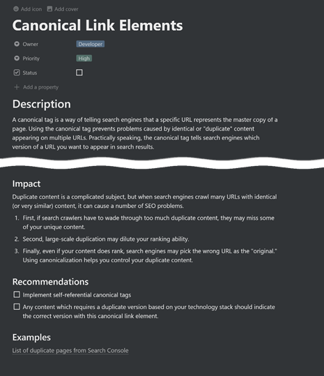 Technical SEO recommendations will impact a wide range of teams across your organization, from developers to content teams and more. If your teams are currently barely keeping up with a two-year backlog of issues, adding fresh Technical SEO recommendations will probably never see the light of day.