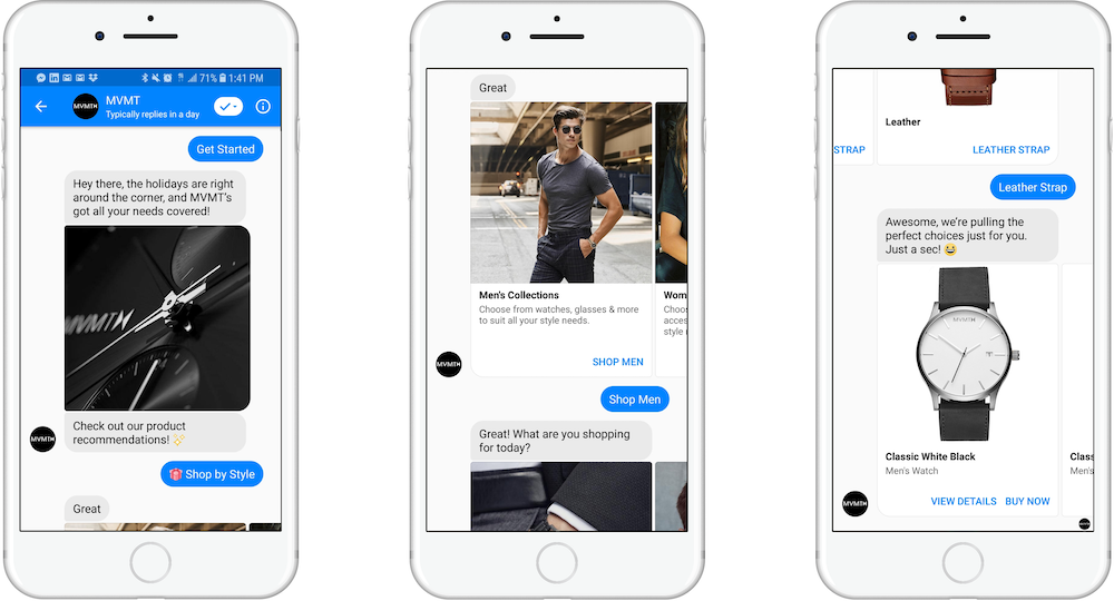 As the example below from MVMT illustrates, a user can tell the chatbot that he or she is looking for a men’s watch and can even provide the style preferred, like a leather band. The chatbot will then curate the best products, along with a link to purchase. The company doesn’t have to stop there either; it can also easily upsell and cross-sell items with a chatbot.