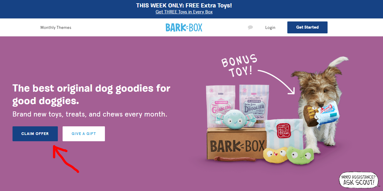 For an example, the Bark Box website includes not one but two call-to-action buttons on the home page that guide consumers through the buying journey. When a user clicks on the button, he or she is taken to a page to make a purchase.