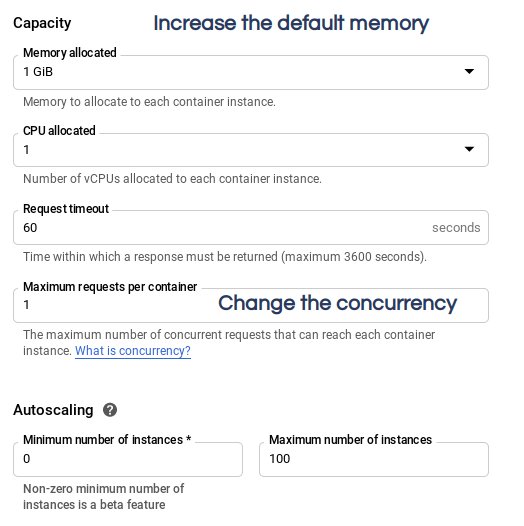 I have found that reducing the concurrency to 1 improves the reliability of the service. This means Google will automatically start a new container for each HTTP request. The downside is that this costs slightly more money.