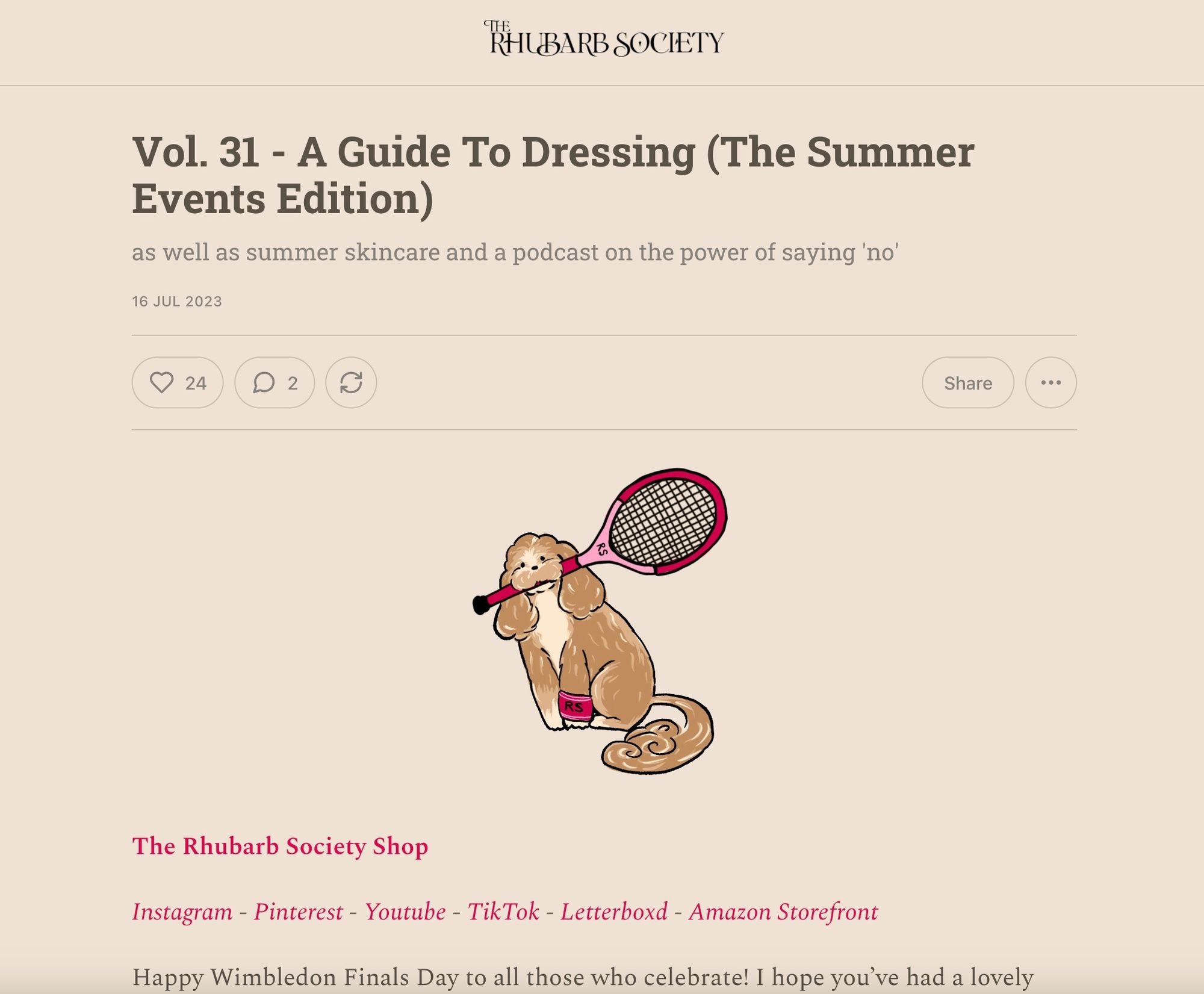 Platforms like Substack might have limited design features, but creativity knows no bounds. The Rhubarb Society uses vintage images and a muted beige background to match the lifestyle and fashion content they publish.
