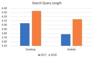 To start, I looked at the length of search queries. The thought is with voice search consumers are using a more natural language. So instead of searching for “car insurance” consumers might search for “cheapest car insurance for Toyota Camry.” Our data shows the average number of words in each query has increased for both mobile and desktop queries year over year. Desktop queries are up 7% year over year to 4.3 words per query. Mobile has increased 9% year over year to 4.14 words per query. With mobile increasing more rapidly I think this shows the impact voice is having, as well as larger devices enabling consumers to input longer queries.