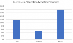 The other area I wanted to dig into was what types of search queries are consumers using. I think voice search has brought an increase of consumers asking questions in a more natural language. Therefore I looked into question modifiers like who, what, where, when, why, and how. The use of these terms indicate more conversational tones. Our data has shown an increase in these terms of 118%, and a majority of that change coming on mobile phones which is up 178%.