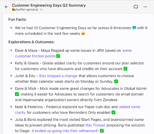 For the duration of Advocacy Day, our Customer Advocates were “on call” in Slack and on Zoom to support our Engineers, Product Managers, and other team members as they navigated conversations with our customers. We took shifts in an open Zoom call where anyone could pop in to ask questions, get support for tricky conversations, or just have company as they worked.