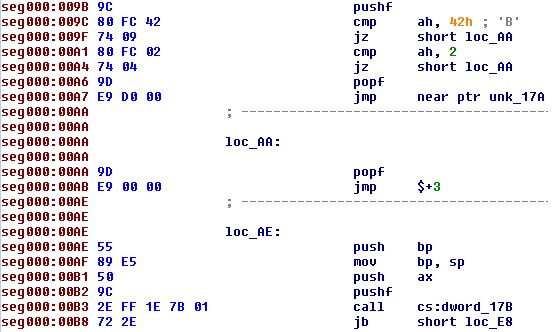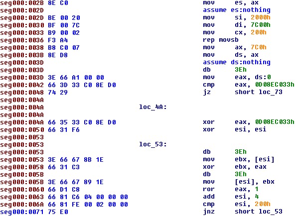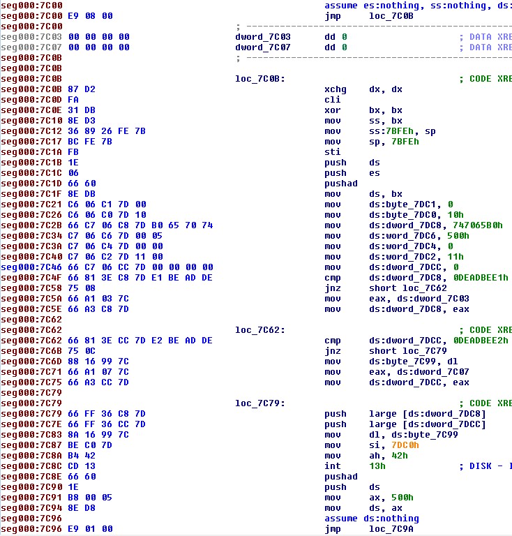 Dopo che Pitou si è agganciato all’interrupt 13h, decifra il Master Boot Record originale (quello prima dell’infezione) all’indirizzo 0:7C00h e lo manda in esecuzione per far partire il “boot” del sistema operativo (figura 6).