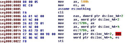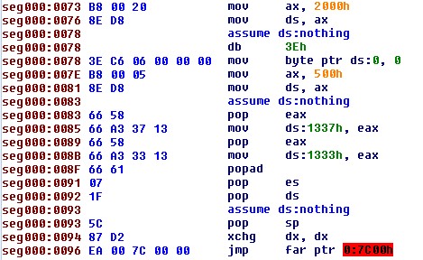 La prima istruzione “call gate selector 8:600h” fa saltare il codice all’indirizzo 0x00000600. All’indirizzo 0x00000600 Pitou ha “patchato” questa area di memoria con gli opcode “0xe9 0x7e 0x4b 0x0 0x0”, in questo modo  esegue un salto (“jump”) all’indirizzo 0x00005183 (0x600 + 0x4b7e + 0x5 = 0x5183). L’indirizzo di memoria  0x00005183 in modalità protetta equivale in modalità reale all’indirizzo 500:0183 dove Pitou è memorizzato in quel momento.