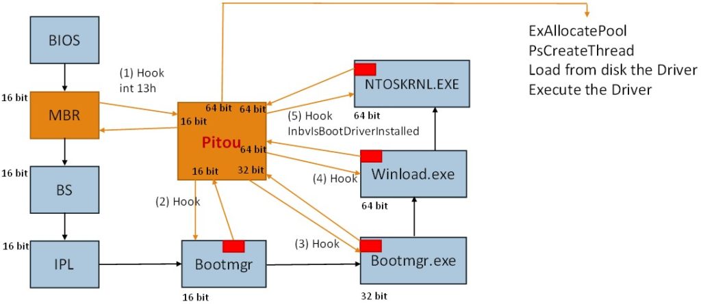 Pitou è l’ultimo dei Bootkit conosciuti che infettano il Master Boot Record, utilizzando queste sofisticate tecniche. I Bootkit dispongo di un forte arsenale per bypassare la policy del “Kernel Mode Code Signing” e sono molto difficili da individuare , perché hanno un elevato grado di invisibilità.