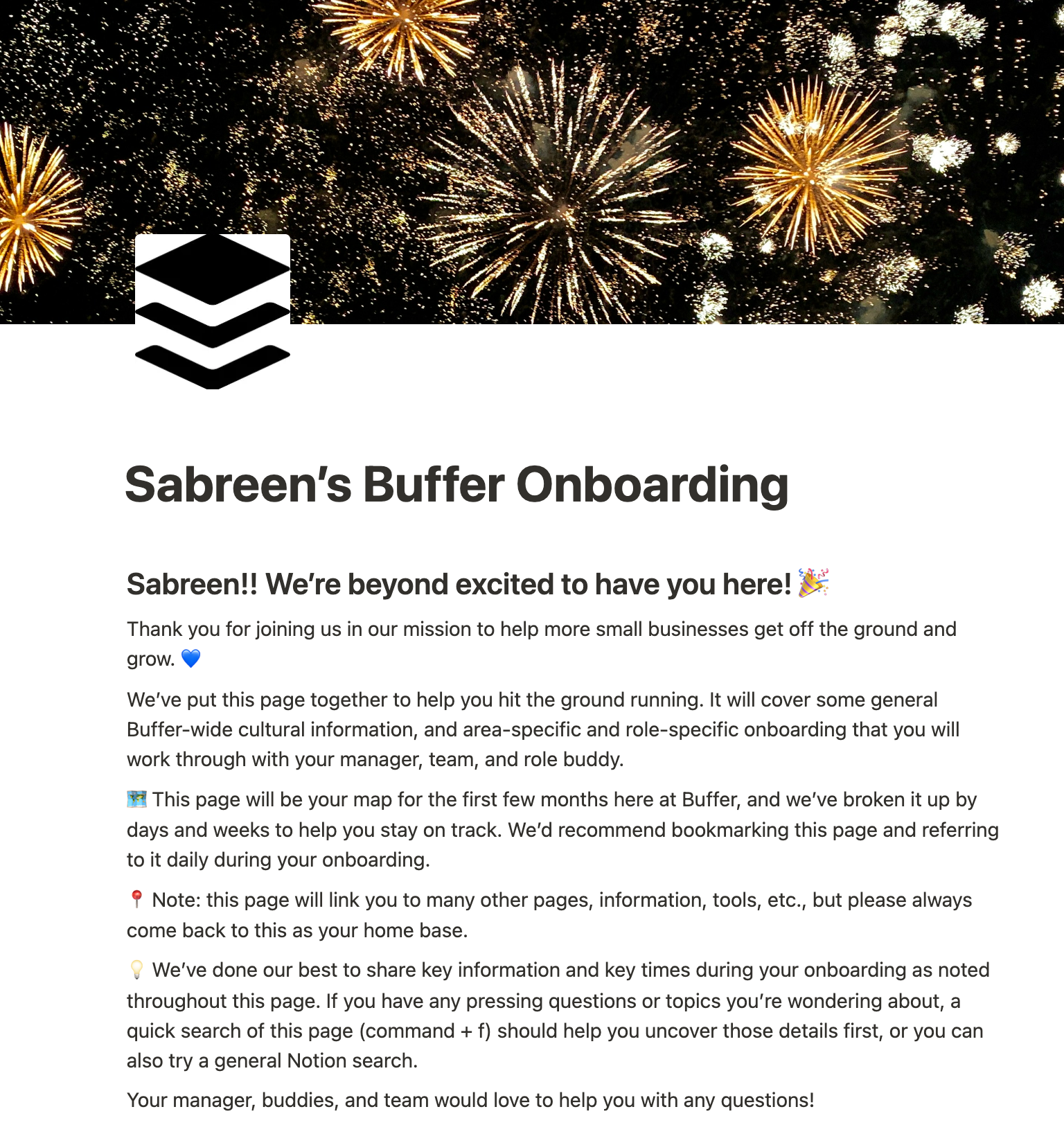 On my first day at Buffer, a well-organized onboarding doc was waiting for me. It outlined everything from reading materials to help me steep in Buffer’s DNA to what was expected of me over the first 30, 60, and 90 days.