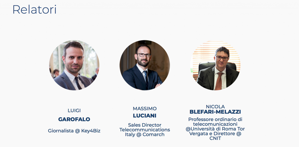 - 10:35-10:50 “Gestione efficiente del 5G Network Slicing con IA e modelli di Business”, intervento di Massimo Luciani, sales director Telecommunications Italy – Comarch