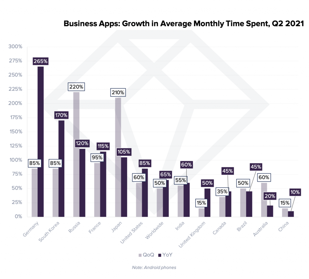 App Annie indica poi i settori coinvolti da abitudini che sono mutate, ma che non se ne andranno: in primo luogo il lavoro ibrido – in un po’ in presenza e un po’ a distanza – sembra tutt’altro che abbandonato in favore di quello esclusivamente in presenza, anzi, il temo trascorso sulle app di business continua ad aumentare, anche neri mercati dove le percentuali di vaccinati sono molto elevate. Insomma, la connettività via mobile è entrata a quanto pare a far parte definitivamente di un nuovo modello di lavoro, anche per quelle aziende che sono sempre state restie o a dotarsi delle infrastrutture necessarie per una transizione, anche solo parziale, di questo tipo, o che pur avendole fino alla pandemia hanno mantenuto un pregiudizio a favore del lavoro in presenza, considerando il dipendente in ufficio sempre più efficiente e concentrato; impressione che a quanto pare con la pandemia si è molto affievolita, se non addirittura scomparsa del tutto.