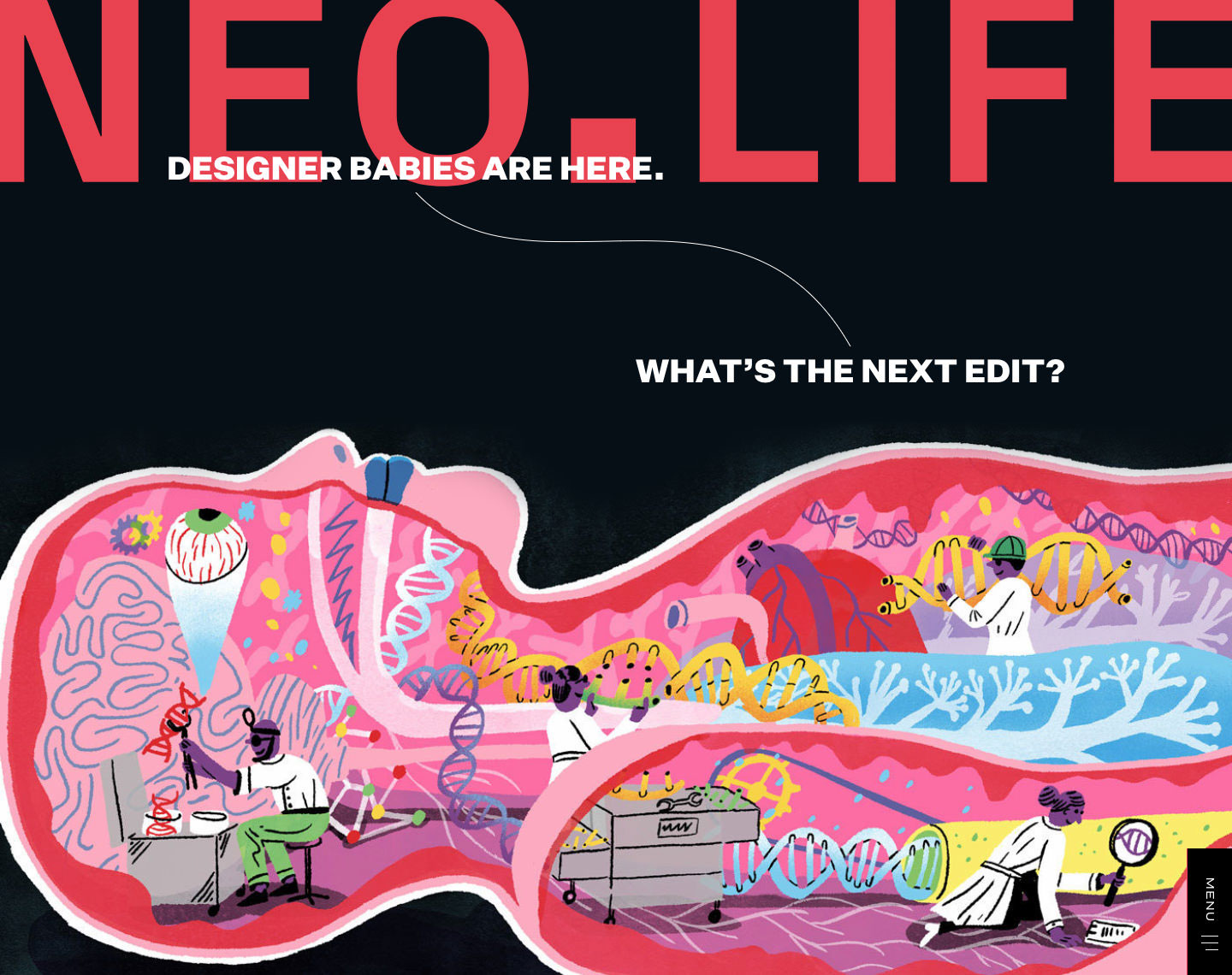 Jane Metcalfe, founder of Wired Magazine, created NEO.LIFE to explore the frontiers of biology, technology, and humanity. In 2021, Upstatement helped her build a unique brand and editorial experience. I think the art direction was really effective because it allows powerful typography and visuals to grab the readers’ attention. In a day and age where we’re bombarded with stimuli, this design succeeds at capturing my eye and making me want to read more. They use boldly contrasting or sympathetic colors to create visual interest, drama, and harmony. The typography Upstatement used for “NEO.LIFE” feels subtly digital and futuristic without being clichéd. The typography they used for the rest of the text allows for contrast and hierarchy.