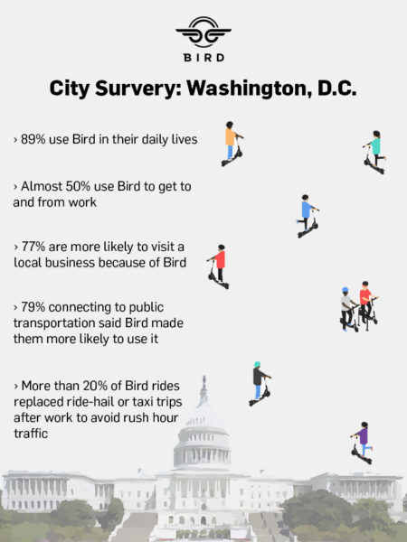 In Washington, D.C., specifically, Bird’s data shows an uptick in public transportation use on the part of Bird users and decreased use of taxis and ride-hailing services after work.