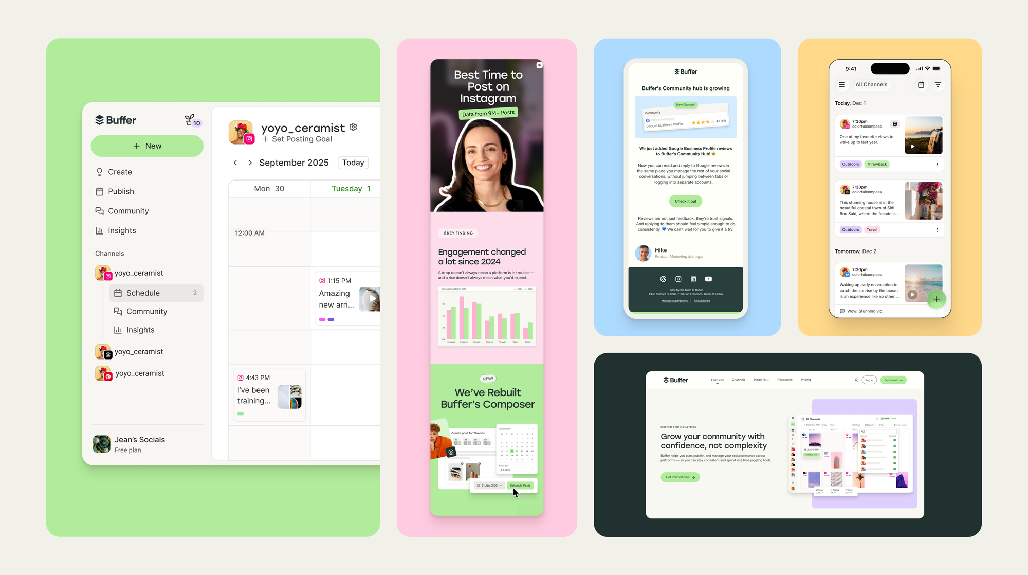 - A vibrant Buffer green adds positivity and helps guide attention without overwhelming the interface. As Kate Baldrey, Marketing Designer, shared, “We went through what felt like thousands of iterations to find a green that felt unique and Buffery without leaning too neon or earthy, and eventually found a shade that felt vibrant enough but balanced and grounded when paired with our neutral tones.”