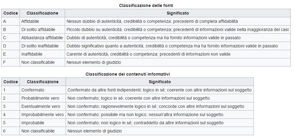 Ogni fonte deve essere valutata e per fare questo si usa un codice che va dalla lettera “A” (affidabile) alla lettera “F” (non classificabile). Tale attività si definisce “classificazione dell’informazione”.