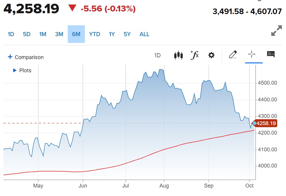 The quick answer to the above question, is that the bounce could be forming now as stock flirt with the 200 day moving average at 4,206 for the S&P 500 (SPY). That is the red line in the chart below.