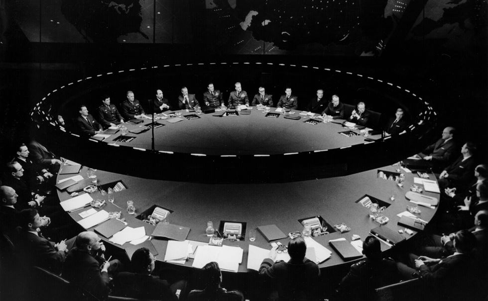 When Stanley Kubrick saw Dr. No, he was convinced that the film’s designer would be just right for Dr. Strangelove. The designer was Ken Adam, and the two men went on to form a close creative partnership. The resulting set for the War Room beneath the Pentagon, built at Shepperton Studios, was later called by Steven Spielberg “the finest set in the history of the movies”.